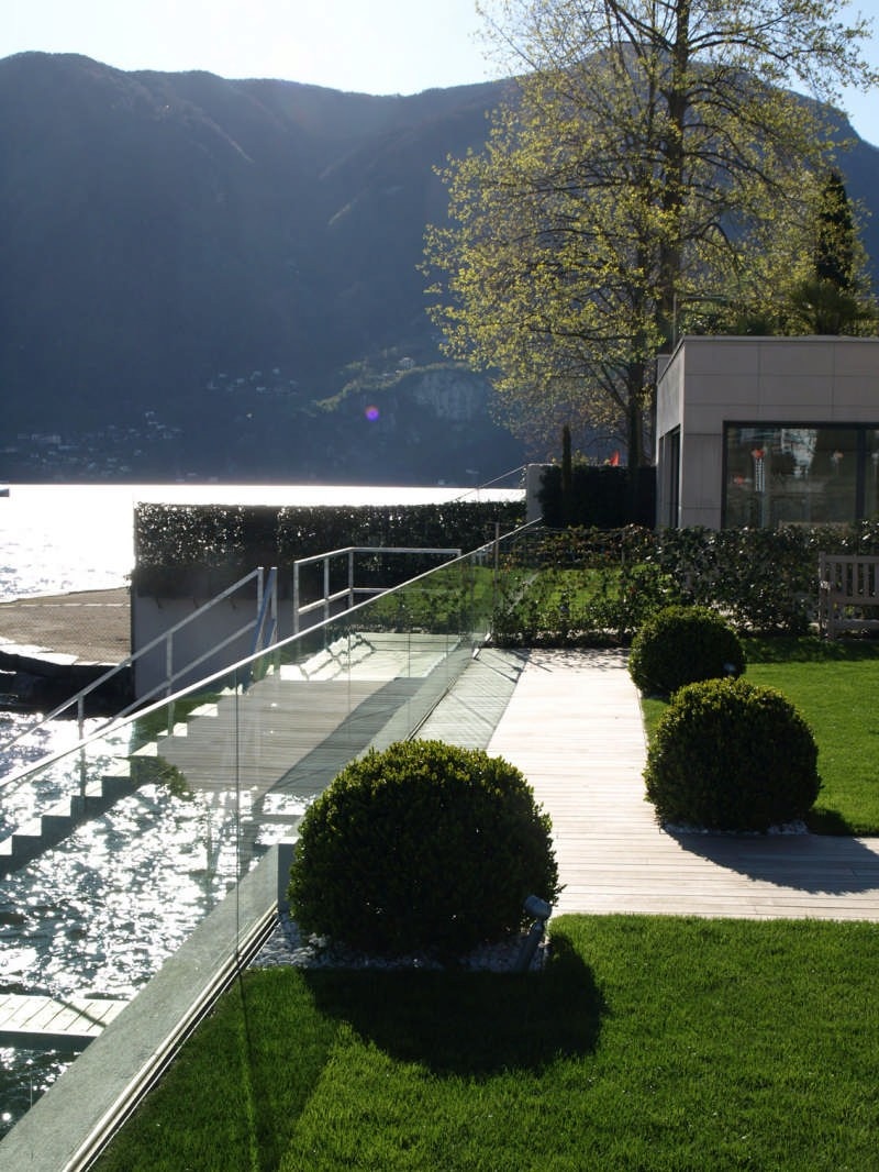 cristallo trasparente. Profili in acciaio separano il prato dal