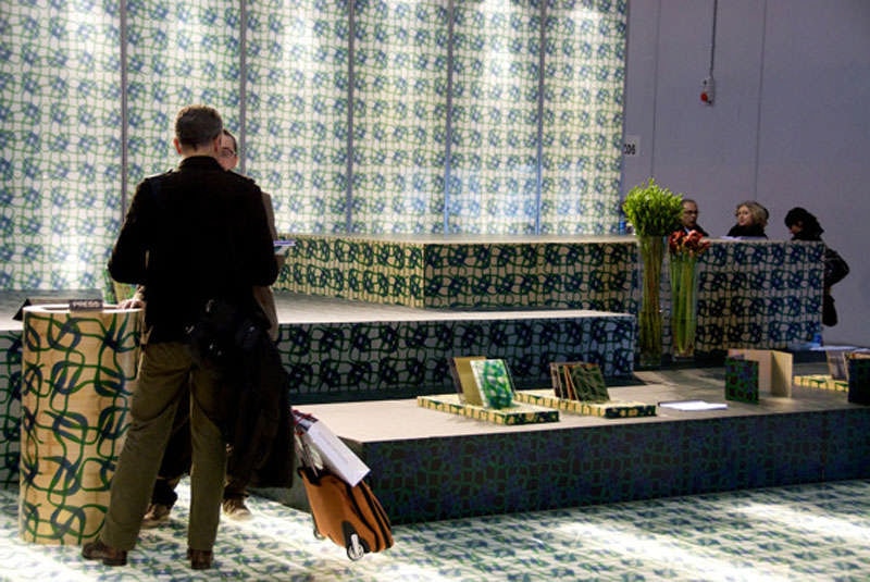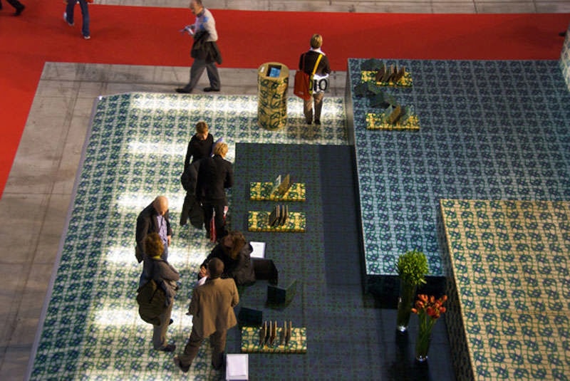 Ciascun gradone è realizzato in un materiale diverso: legno, metallo e gomma sono trattati con vernice solida Maravee, mentre il vetro, che si ritrova anche nella parete di fondo, è finito con il nuovo trattamento Veriveri. Un elemento totemico circolare che funge da contenitore per brochure e materiale cartaceo è rivestito con vernice solida Maravee a dimostrare l'adattabilità alle superfici curve. Il pattern decorativo che uniforma lo scenario coprendo tutte le superfici dello stand è stato progettato ad hoc da Iacchetti. La grafica propone non a caso motivi legati al mondo vegetale: liane, alghe e fili d’erba stilizzati nelle tonalità del verde (ecologia) e dell’azzurro (sostenibilità).