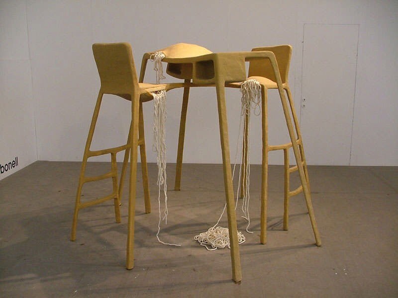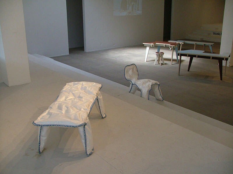 Seam chair & bench di Chris Kabel: un'evoluzione del prodotto che il designer americano ha sviluppato per il progetto Dry Tech III di Droog. La sedia e la panca sono fatte di un tessuto economico utilizzato normalmente per imballaggi industriali che viene cucito per assumere la forma dell'oggetto.