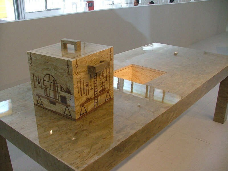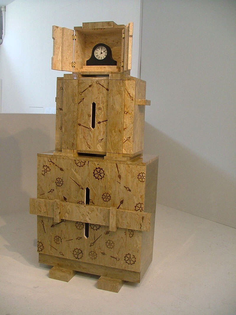 Tool inlays e Clock inlays di FormaFantasma - Andrea Trimarchi & Simone Farresin: serie realizzata con pannelli di compensato grezzo sui quali sono incorporati intarsi dalle forme intricate che ne trasformano completamente la natura povera. Mentre nel tavolo gli intarsi prendono la forma degli strumenti utilizzati per fabbricare il tavolo, nel concept dell'orologio una economica sveglia è custodita in un più prezioso contenitore intarsiato.
