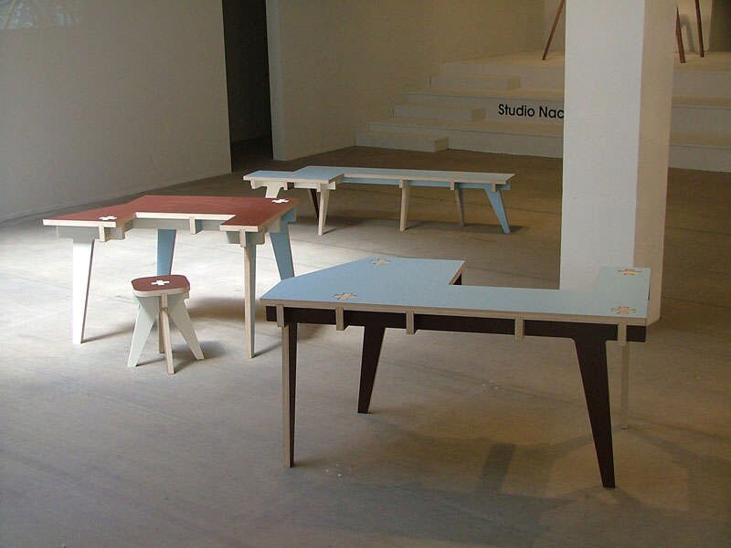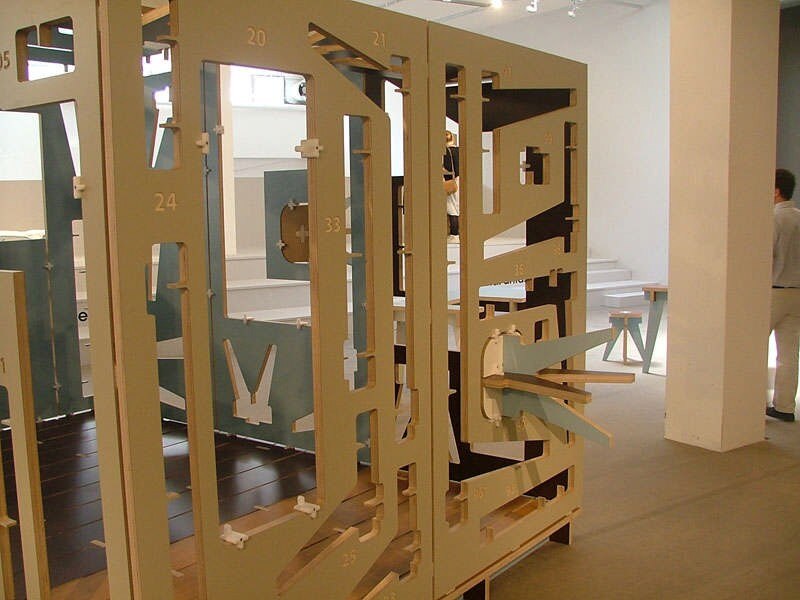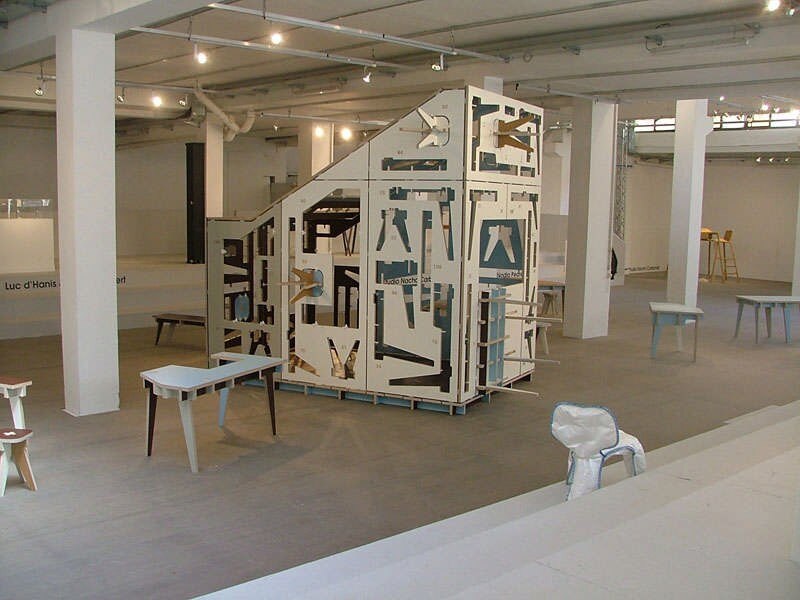 Vista dell'allestimento con al centro la "House of furniture parts" di Studio Makkink & Bey: arredamento e magazzino sono uniti in un unico elemento. I progetttisti sono partiti da pannelli standard di legno stratificato e, grazie a tagli eseguiti con macchine a controllo numerico, hanno creato una casa in miniatura che può essere ospitata all'interno di strutture più grandi, di uffici, studi o loft.