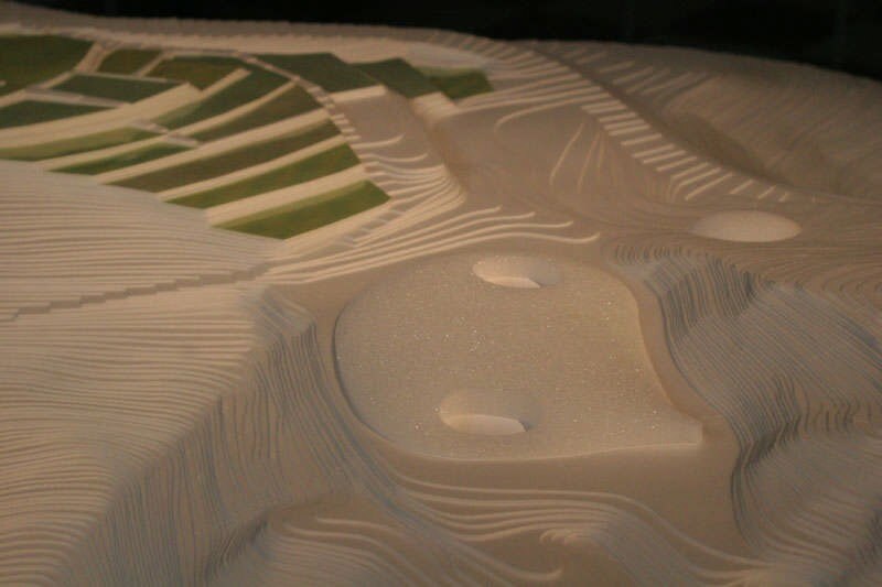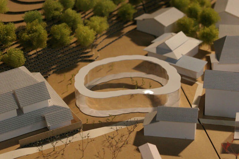 In alto: Modelli e disegni del struttura a guscio del Teshima Art Project (Museum) di Ryue Nishizawa. Al progetto ha partecipato l'artista Rei Naito. Il suo completamento è previsto per l'estate del 2010.