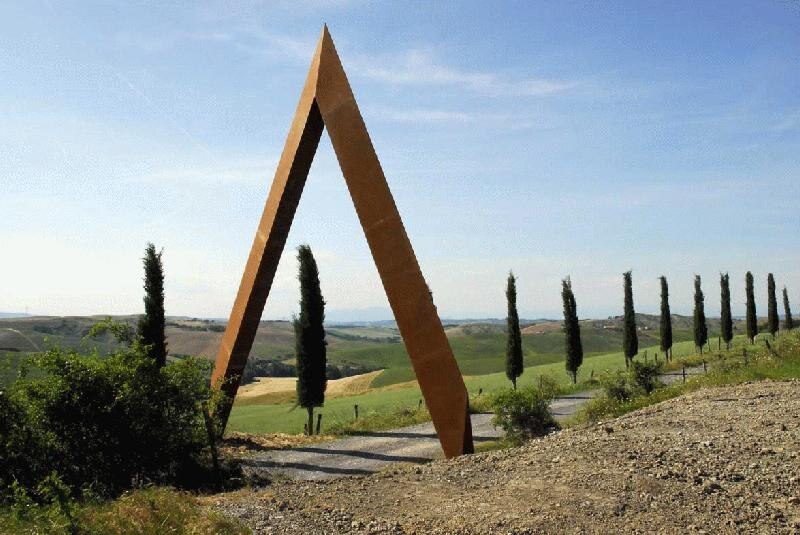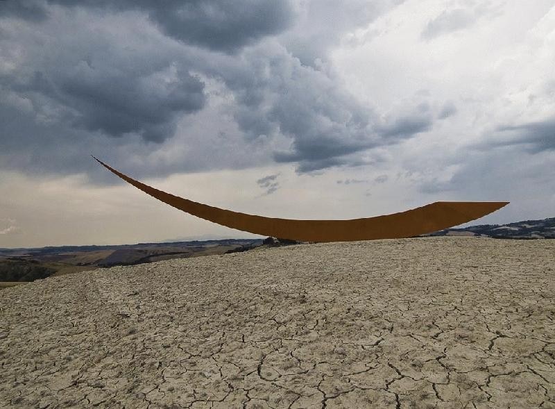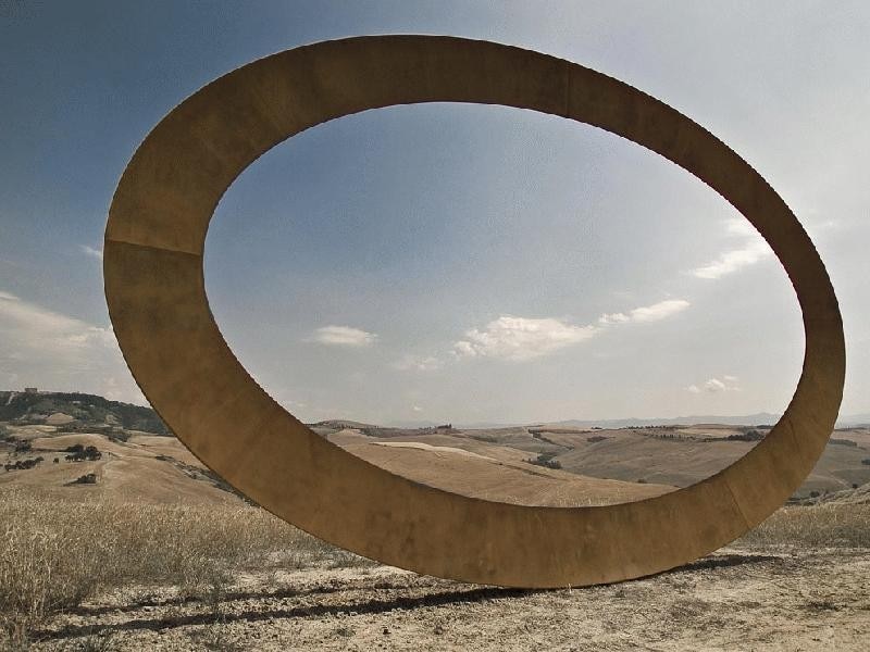 L’interesse per alcuni luoghi legati alle esperienze dell’infanzia dell’artista si apre alla considerazione della conformazione geofisica di un territorio plasmato da secoli di sapiente lavoro contadino, di attenta cura e conoscenza della terra. Ecco allora che Staccioli concepisce un grande segno ellittico che circoscrive la vista e la concentra, inquadrando la vecchia casa dei nonni materni e spaziando verso le Balze, zona caratterizzata da frane e fenomeni di erosione tipici del terreno argilloso, duro e fragile allo stesso tempo.