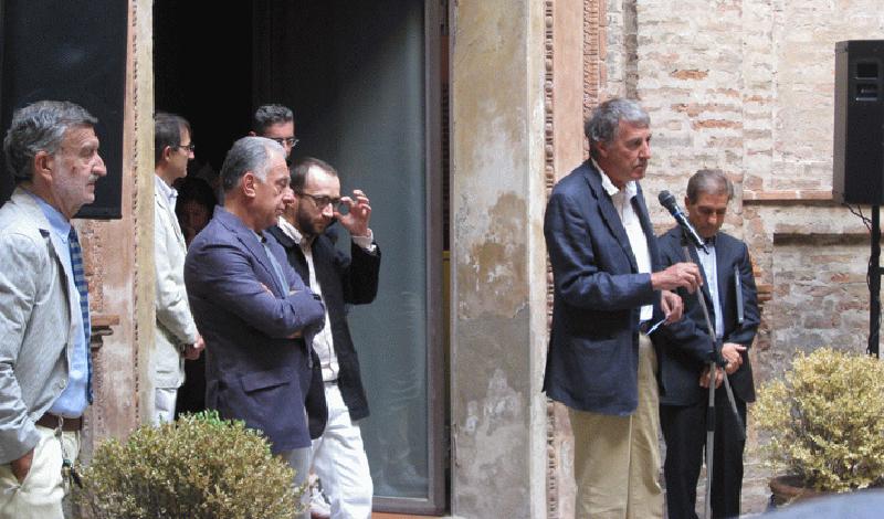 1. Cortile della Casa del Mantegna, da sinistra: Italo Lupi, ha curato il progetto grafico del catalogo della mostra "Angelo Mangiarotti. Scolpire/Costruire", ed. Corraini; Arch. Giampaolo Benedini, ha curato l'allestimento della mostra; Beppe Finessi e Fabrizio Schiaffonati, Direttore del Dipartimento BEST del Politecnico di Milano, durante il suo intervento