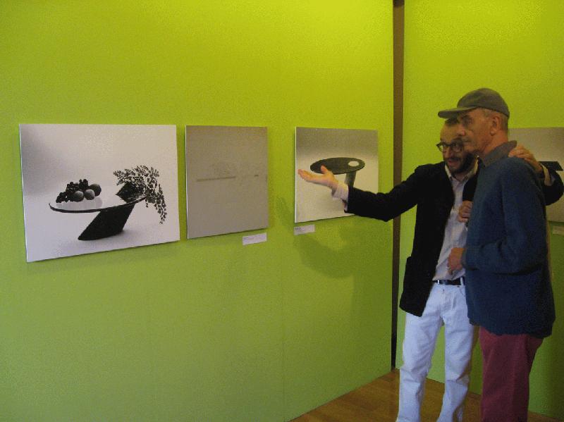 6. Beppe Finessi e Corrado Levi di fronte alle fotografie esposte, in primo piano: Tavolozzo, 1974. Produzione Fontana Arte