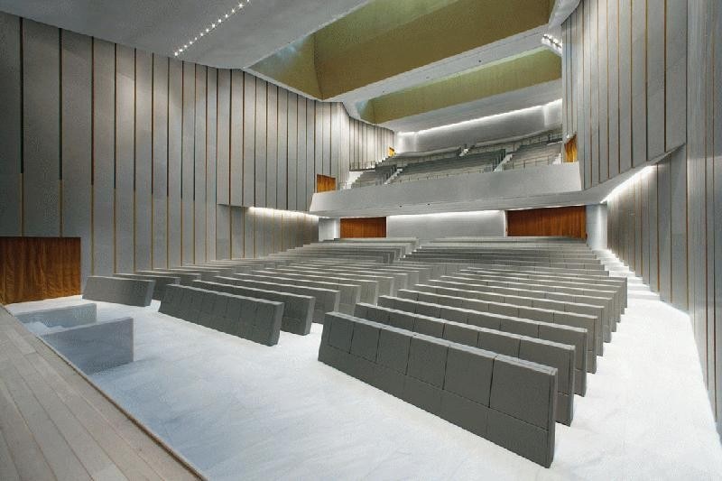 L’Aula Magna, con le sue compatte poltrone disegnate da Dante Bonuccelli in stretta collaborazione con gli architetti e prodotte da Lamm, si presenta come uno spazio nitido e ordinato, sia vuoto che popolato da spettatori/studenti. Per la loro stessa concezione (il sedile aderisce totalmente allo schienale in fase di riposo, trascinando con sé i braccioli), le poltrone si presentano in file simili a bassi e lineari muri di pelle grigia.