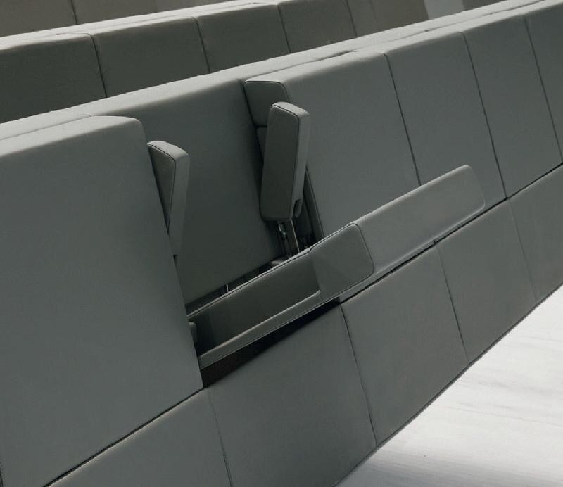 Il telaio metallico portante è fissato direttamente alla struttura della pavimentazione, in modo da eliminare qualsiasi appoggio a vista; i braccioli, ad apertura sincronizzata con il sedile, sono regolati da un dispositivo di movimento a scomparsa che li integra nella seduta. (foto 4)