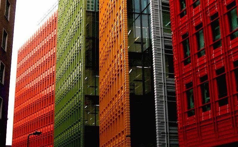 Renzo dichiara che la scelta dei colori primari, quale elemento caratterizzante il nuovo complesso di appartementi e uffici a Saint Giles è stata ispirata dall’improvvisa sorpresa che viene dai colori brillanti in questa parte della città, tanto più forte –la sorpresa- quanto più grigio e abbandonato è stato questo angolo urbano del centro di Londra.