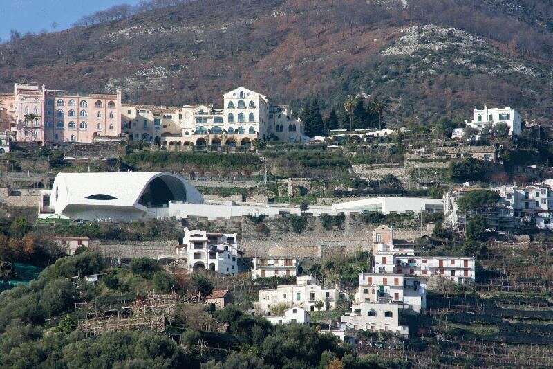 Solo andando sul posto si può avere la piena consapevolezza di quanto sia stupefacente l’adesione dell’opera al territorio per il quale è stata progettata e s’intuisce quanto l’architetto brasiliano abbia studiato, compreso e fatto suoi i canoni dell’architettura ravellese e, più in generale, dell’identità mediterranea, quanto abbia ascoltato e assecondato, oltre al proprio “genio” il genius loci. All’auditorium si accede da una piazza stretta e lunga, la cui particolarità è quella di offrire contemporaneamente una vista dell’edificio ed una vista panoramica, ma pensata per essere, indipendentemente dalle attività dell’auditorium, luogo di scambio e di incontro. L’entrata è protetta da una copertura di forma curva e molto dinamica, tipica del gesto creativo dell’architetto che più volte è stato definito “scultore di monumenti”. All’interno, lo spazio destinato ad accogliere il pubblico sfrutta, ma sarebbe meglio dire asseconda, il declivio naturale del terreno, mentre l’orchestra e il foyer occupano una parte dell’edificio completamente aggettante nel vuoto. Dall’interno si può godere del panorama dall’ampia vetrata di accesso e dall’oblò posizionato dietro l’orchestra. Il lato opposto all’ingresso è quello che divide l’auditorium dagli edifici confinanti e, dall’esterno, allude, con la sua forma sinuosa ad elmo, alle origini medioevali del paese. Per quanto riguarda l’aspetto dell’acustica, la nitidezza del suono all’interno sarà garantita dalla forma concava dell’edificio che riprodurrà fedelmente l’effetto di una cassa armonica. Per concludere la descrizione del progetto dell’auditorium, realizzato dalla cooperativa anti-camorra Edil Atellana con sede nel casertano, niente di meglio delle parole dello stesso Niemeyer: “…e io mi metto a immaginare, soddisfatto, questa piazza costruita, degna – forse – della città di Ravello, una delle più belle d’Italia…”.