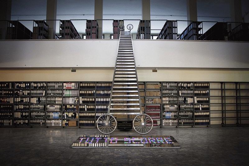 Si giunge quindi all’ampio spazio del salone, vera meta finale del labirintico percorso, dove appoggiata al ballatoio si trova Ad Astra: una grande scala in acciaio con scritte incise e colorate a smalto su ogni gradino. La lettura consente di scoprire una cronologia di eventi frammisti tra loro: alcuni fondamentali per la nostra società, come il voto alle donne, altri minimali, come l'acquisto di un terreno; dunque porzioni di paesaggio umano, senza discriminazione tra la visione globale e la vita del singolo. La scala poggia ed è sormontata da ruote: una sorta di riferimento al tempo e al suo scorrere infinito. Lo stesso salone ospita l’opera che chiude il percorso espositivo. In collegamento concettuale con le parole Memoria e Oblio, punto d’inizio del percorso, s’incontrano ora le parole Tutto Scorre, non più in forma monumentale, ma lievemente tracciate su un pavimento di specchio con sassi in vetro policromo. Forse è la morale finale di un viaggio in cui lo spettatore è forzato alla riflessione proprio dallo stupore indotto da installazioni e da una location sicuramente eclatanti.