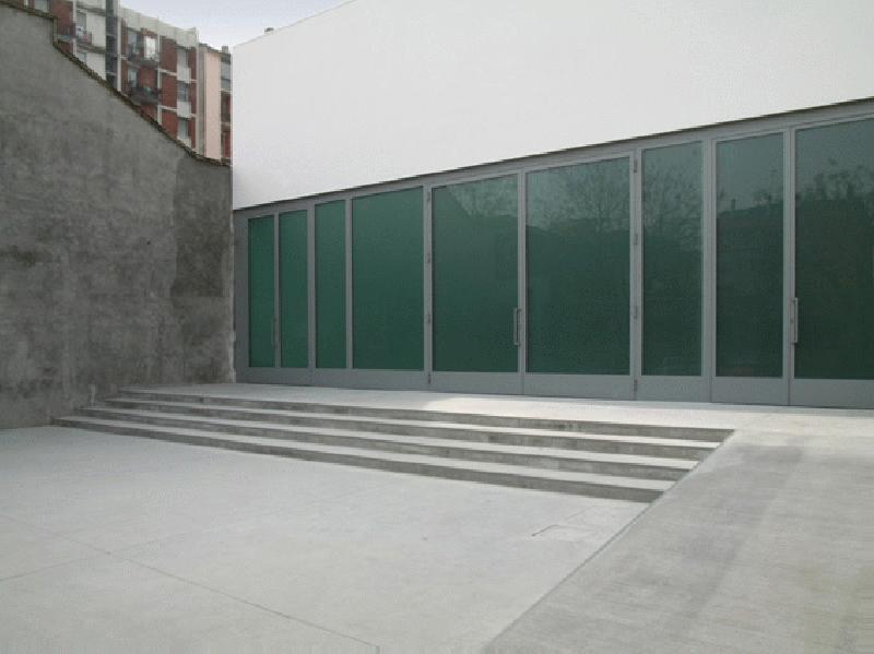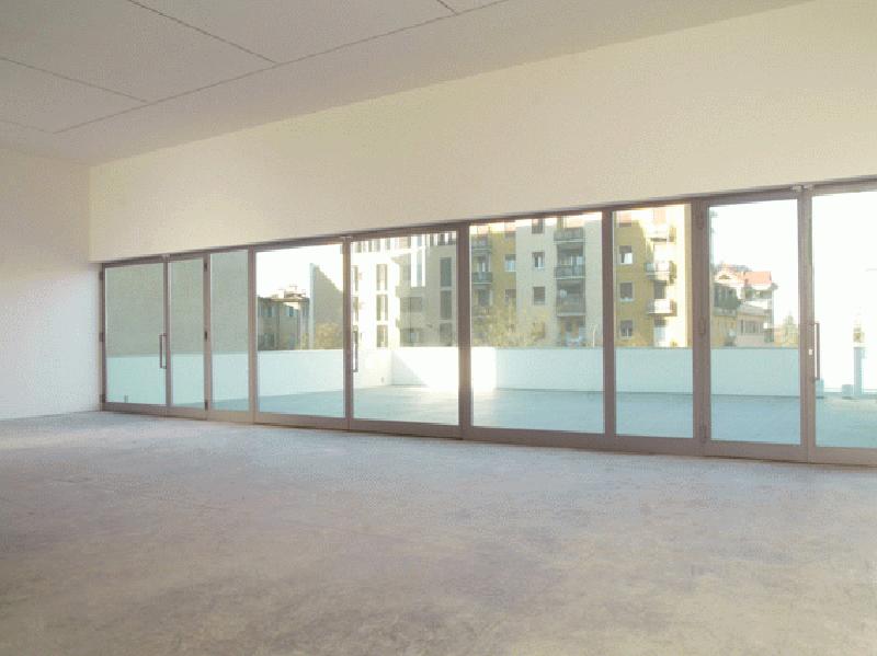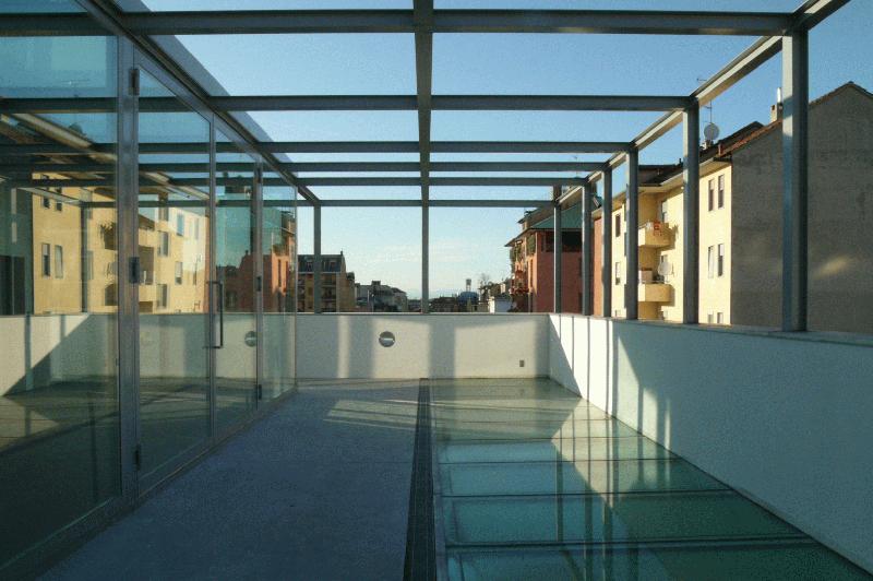 Il piano terra si apre sul cortile d'ingresso attraverso una grande vetrata suddivisa dai montanti dei serramenti il cui ritmo è scandito dall'alternanza tra ingressi pedonali e grandi aperture per l'accesso delle opere di grandi dimensione. La medesima scansione è ripetuta nella vetrata di accesso alla vetrata del primo piano e riemerge sul terrazzo di copertura sottoforma di pergolato in profilati di ferro che fungono anche da struttura portante per la serra vetrata posta in cima all'edificio.