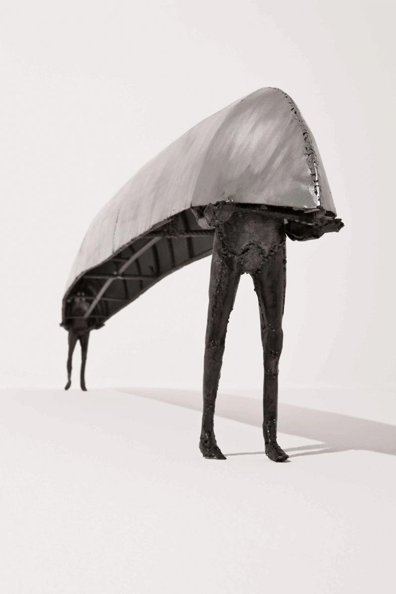 Esterno e interno, dalla piazza alla chiesa. La scultura, la pittura e il disegno diventano tappe di una riflessione sulla clandestinità, in un sistema di materiali diversi (alluminio, ferro, cemento, catrame, bronzo e carta) e rimandi iconografici. La chiglia sugli uomini, i cani nella chiesa, la folla sulla carta.