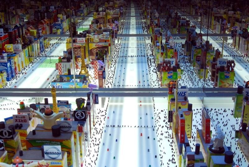 Sono La città archeologica e La città reale proposta nel Modello teorico della civiltà merceologica esposto alla Biennale di architettura 2010 nella mostra Per una Nuova Carta di Atene di Andrea Branzi. Basta sostituirgli la Tour Eiffel con una gondoletta di plastica. Branzi espone infatti in Biennale una serie di modelli analitici che rappresentano altrettanti punti di vista sulla città contemporanea interrogandosi, soprattutto con Interno continuo, sul tema stesso della Biennale con cui il curatore, l’architetto giapponese Kazuyo Sejima invita a riflettere sul ruolo della folla nell’architettura, che è un ruolo centrale della riflessione teorica dei prossimi anni dal momento che siamo sette miliardi di persone urbanizzate: viviamo in un sistema che non ha più un esterno, in un territorio infinito, monologico e ingovernabile nel quale un’architettura che invece è ancora basata sui perimetri, sulle fondazioni, sulle aree chiuse entra necessariamente in crisi.
