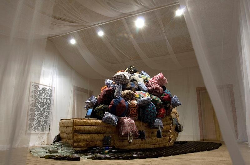 tecnica mista (legno, tessuto, bottiglie), dimensioni