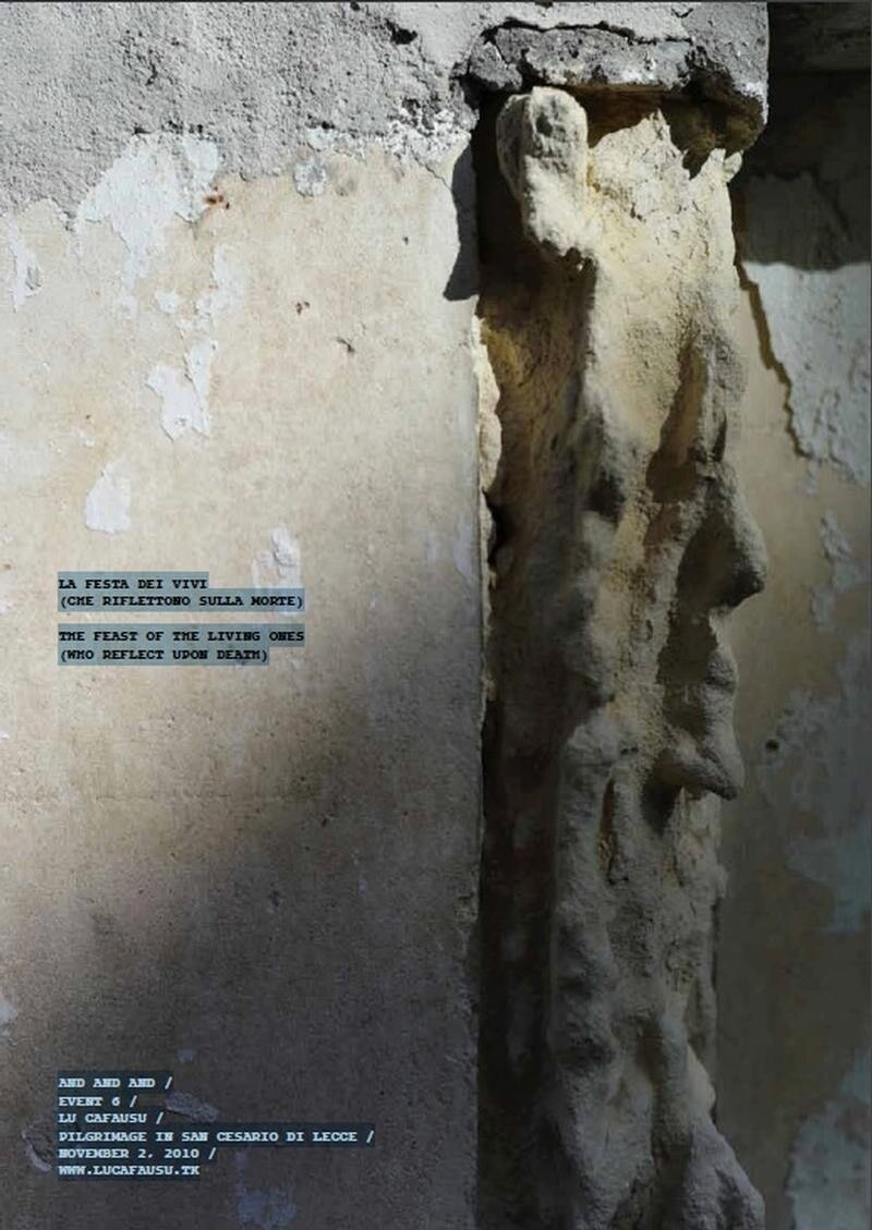 Per il sesto evento, AND AND AND ha invitato Emilio Fantin, Luigi Negro, Giancarlo Norese e Cesare Pietroiusti che, con la collaborazione di Luigi Presicce, propongono di trasformare la tradizionale “Festa dei morti” in una nuova celebrazione, la Festa dei Vivi (che riflettono sulla morte). Per l’inaugurazione di questa festa gli artisti invitano tutti a partecipare al pellegrinaggio più breve e più lento del mondo, una festa e un pellegrinaggio per celebrare la vita. Una riflessione sulla morte come trasformazione, soglia, mistero, ma anche come necessario orizzonte di senso. Un pellegrinaggio circolare che ritorna al punto di partenza: Lu Cafausu, a San Cesario di Lecce. Lu Cafausu è un luogo immaginario che esiste per davvero, anomalia architettonica ed esistenziale, sistema di potenzialità che produce metafore e narrazioni, perché non può essere definito senza provocare un nonsenso, perché esso è evidentemente portatore di una storia e di un qualche significato, ma nessuno sa esattamente quali siano.