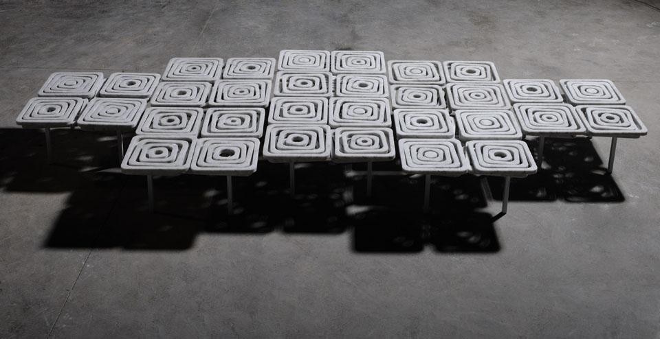 Questo l'invito che Ulian ha ricevuto da Le Fablier: disegnare cinque pezzi da produrre in serie limitata, e di cui tre sono in mostra a Milano, presso la Galleria il Castello. Qui Ulian presenta Numerica, una libreria formata da moduli sovrapponibili la cui forma rimanda alla numerazione romana; Brecciato, un tavolo formato da quattro 'frammenti' che possono essere utilizzati anche singolarmente. E, infine, Concentrico: un tavolo il cui piano è costituito da una tessitura di moduli quadrangolari. Gli ultimi due pezzi sono in mostra al Salone del Mobile, nello stand Le Fablier.