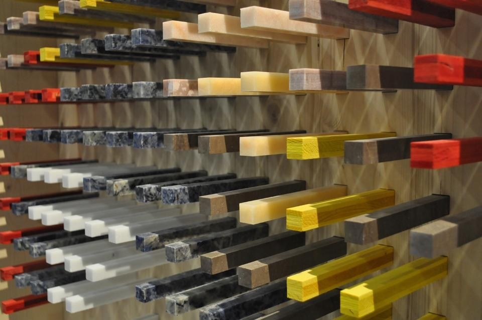 Un sistema a incastro, componibile con elementi circolari in marmo policromo, come i giochi dei bambini, crea una parete divisoria flessibile, un piano d'appoggio, un sostegno più piccolo, sviluppando un sistema orizzontale e verticale. Gli elementi in marmo — Bianco Lasa, Verde Cipollino, Verde Guatemala, verde Ming e Verde Acquamarina — si intrecciano con elementi in legno grezzo color fluo. Il gioco di combinazioni dei colori è infinito, la texture degli elementi alterna finiture lisce o fresate, che movimentano la struttura.
