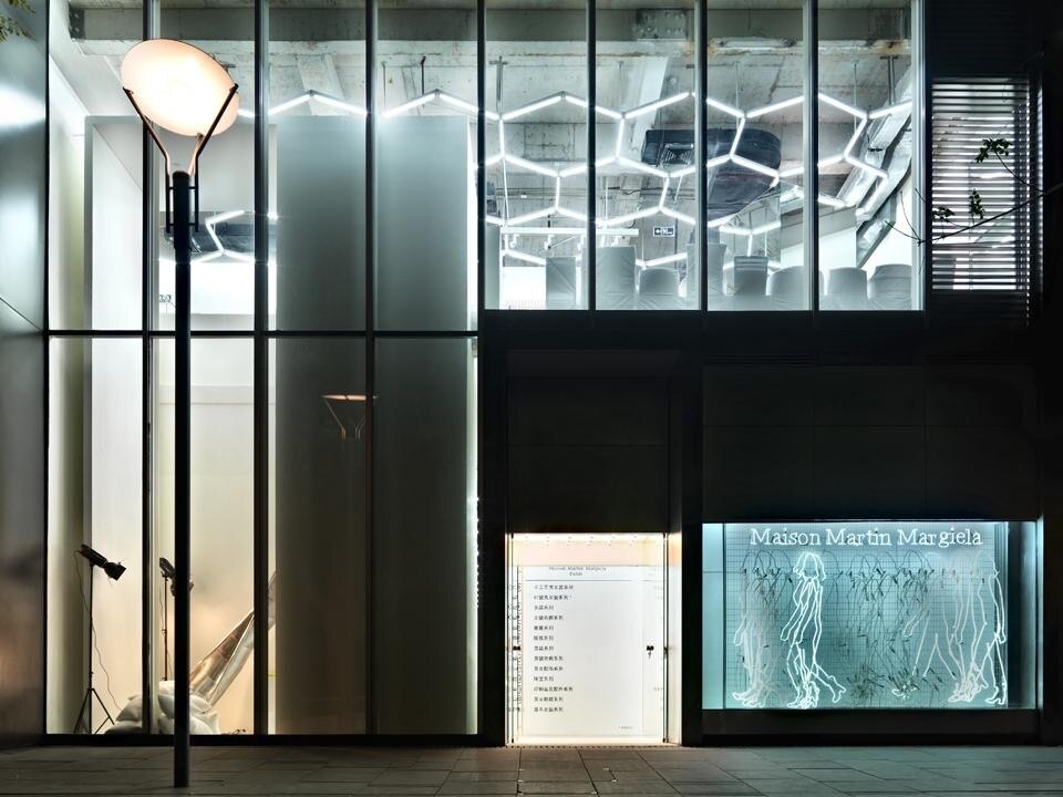 La boutique di due piani che si affaccia sulla strada ha una superficie di 540 m2. Nella vetrina, le luci al neon disegnano una donna che sembra camminare e le parole Maison Martin Margiela. Attraverso la facciata di vetro, s'intravedono le linee semplici e pulite dell'interno, arredato con gli iconici toni del bianco e argento della Maison. Il soffitto, rivestito in cemento grezzo e decorato con luci fluorescenti esagonali, mostra la firma dello stile minimalista così caro alla Maison.