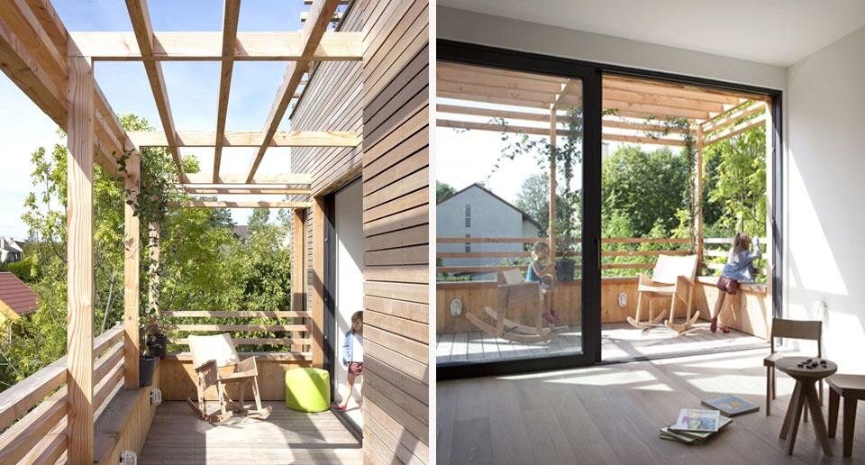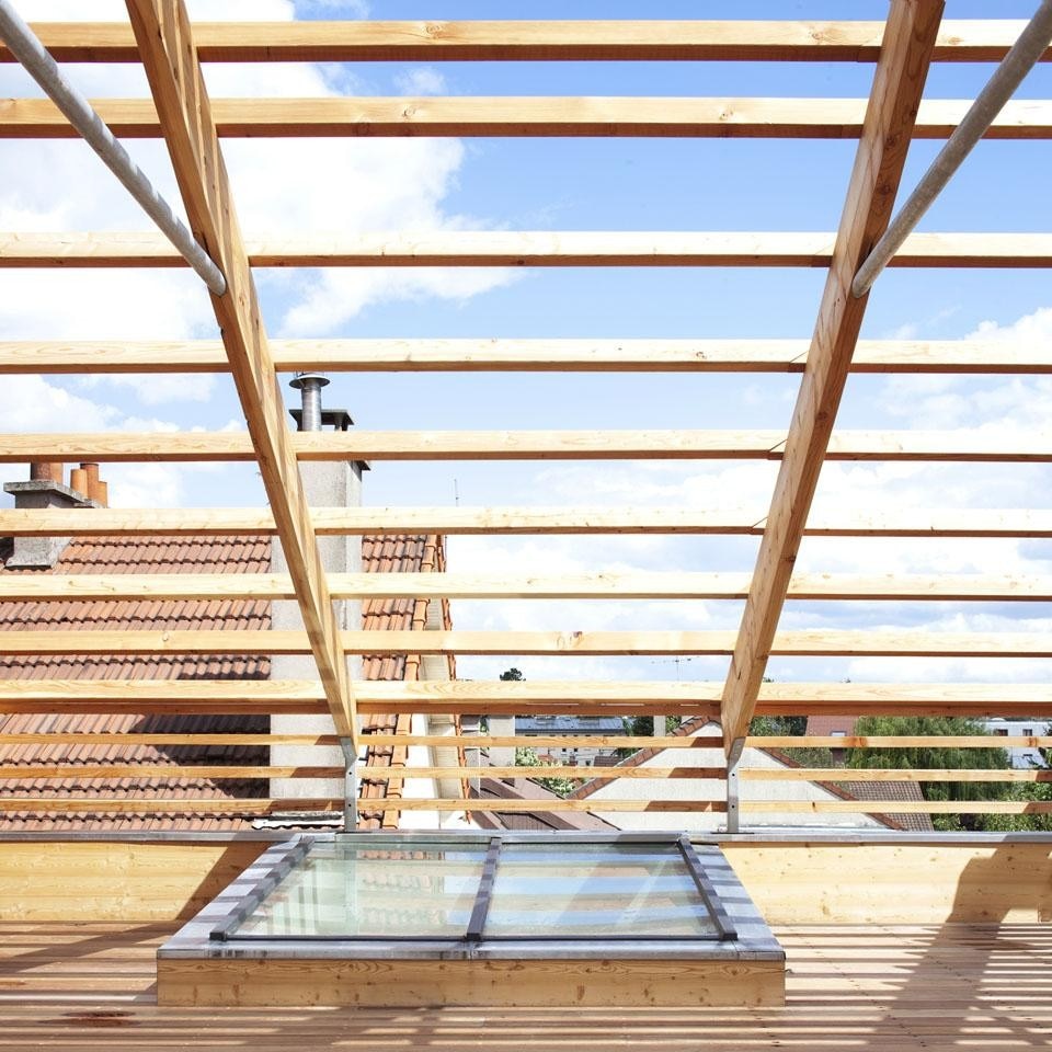 In alto, la forma del tetto/pergola, che ha l'aria incompiuta, ha una funzione ben precisa. Da una parte riprende l'archetipo del contesto e si inserisce in esso senza interromperne il ritmo urbano, d'altra parte, è una soluzione alternativa al tetto tradizionale che sarebbe diventato uno spazio inutilizzato.