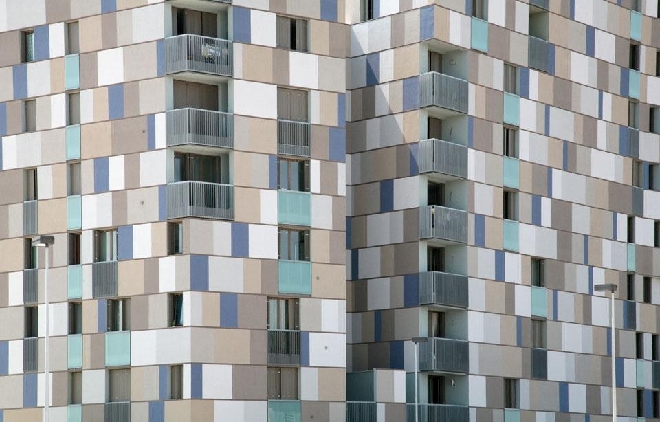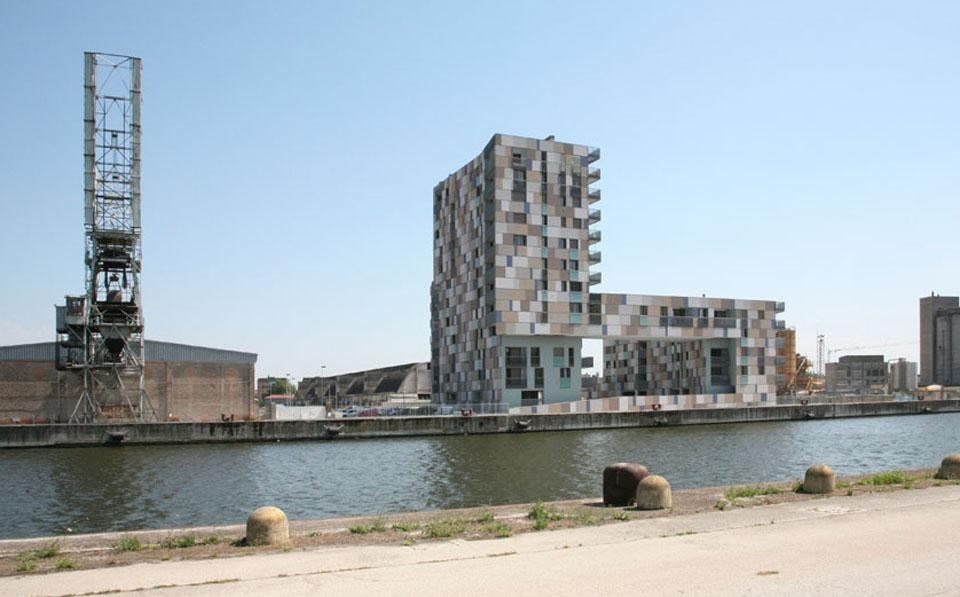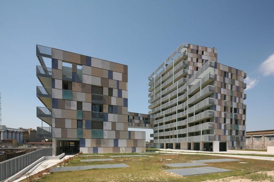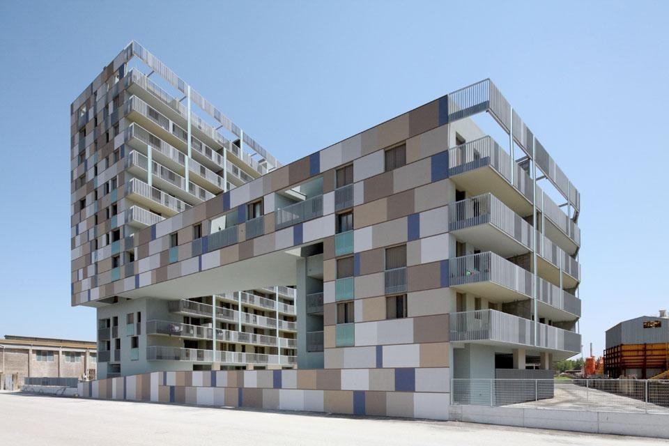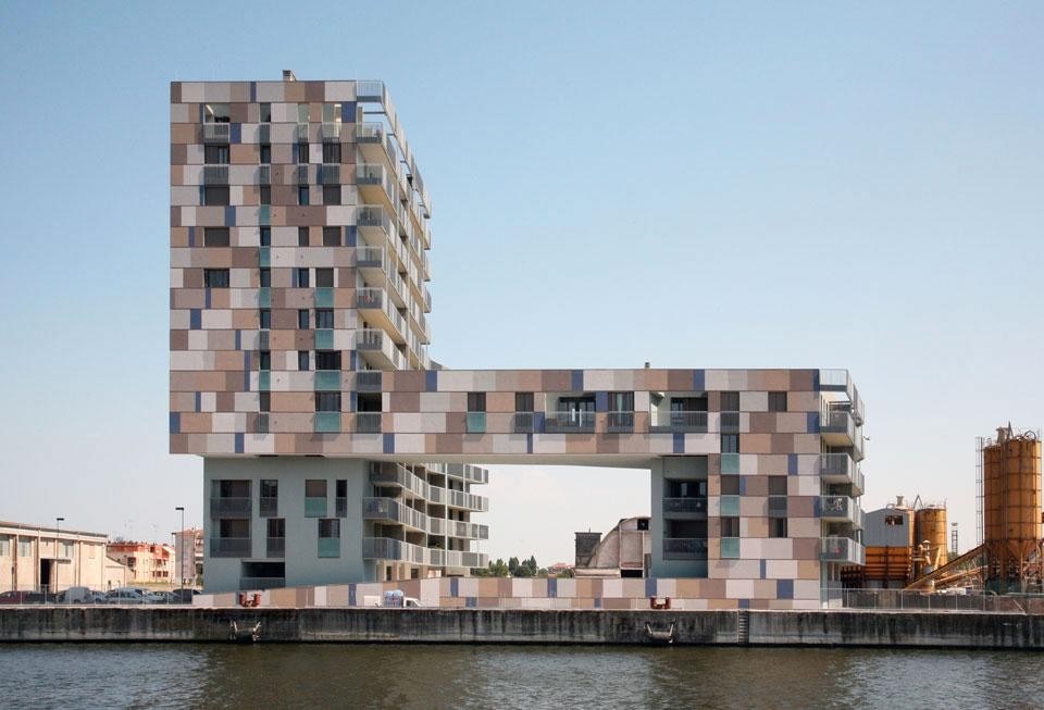 Sul lato verso la città, uno spalto verde che contiene il parcheggio seminterrato porta dolcemente a una corte centrale ad una quota rialzata che guarda verso l'acqua. Una serie di piccoli spazi commerciali e gli atri che portano ai blocchi di circolazione verticale si aprono verso questo spazio semi-pubblico, che è connesso alla futura passeggiata sull'acqua da una rampa che corre parallela ad essa. Le inflessioni geometriche dei due blocchi edilizi e il "ponte abitato" che li collega sul lato dell'acqua contribuiscono a dare un senso di perimetro spaziale e di intimità alla corte centrale. La differente altezza tra i blocchi è determinata in rapporto alle viste lunghe sulla città e all'orientamento solare dell'intero complesso. Mentre le facciate a nord sono trattate con una logica formale che conferma la loro essenza volumetrica interrotta dalle finestre, le facciate a sud sono segnate dalle lunghe linee orizzontali dei balconi a mensola. Le facciate principali dell'edificio sono caratterizzate da una serie di profili orizzontali scavati, due per ogni altezza di interpiano, che inquadrano riquadri di intonaco. Queste campiture di colori diversi – varie tonalità di grigio caldo e blu cobalto – creano una sorta di grande "mosaico", indirettamente ispirato dalla famosa arte bizantina di Ravenna, che genera una sorta di distorsione scalare nella percezione dell'edificio. Questo effetto di momentaneo "mimetismo" della dimensione dell'edificio aiuta a connettere la sua dimensione "domestica" alla percezione dello stesso dalle viste lunghe dalla città e dall'acqua, dove sorge isolato come un "monumento" temporaneo nell'attesa che lo sviluppo atteso trasformi il paesaggio di questa parte urbana.