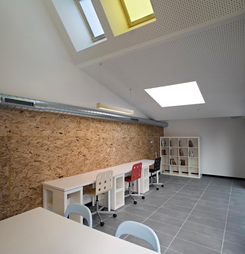 Le falde di copertura a differente inclinazione integrano lucernari in grado di garantire il corretto illuminamento dei locali convogliando negli spazi la luce zenitale.