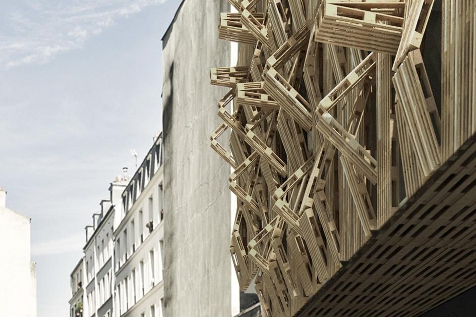 Nessun edificio sarà distrutto, e nessun inquinamento generato. La pelle è costituita da un modulo esistente: pallet di legno. Tenuti insieme da cerniere orizzontali, i pallet spingono verso l'alto, consentendo privacy o aperture di grandi dimensioni. La modularità delle varie palette crea geometrie variate, che si basano sull'uso e che sono rigenerate di continuo. La riappropriazione dei materiali ricicla l'esistente senza ulteriori elaborazioni, che costerebbero energia in termini di produzione e d'inquinamento. Il vero approccio ambientale non consiste nella distruzione, ma nella sovrapposizione d'interventi sul nostro patrimonio edilizio. Si tratta di una nuova strategia di utilizzo del terreno, senza riferimenti a un lotto preciso, costruito con una "ecologia" de facto dei mezzi.