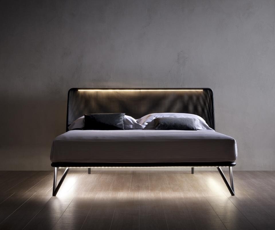 Tra le molte nuove proposte, Essentia il letto disegnato dallo Studio Thesia, riassume il concetto di semplicità, leggerezza e versatilità. L'innovativo e resistente tessuto elastico calzato sulla testata è duttile e confortevole come lo schienale di una sedia. Alto da terra il letto è disponibile sia nella versione matrimoniale che singola