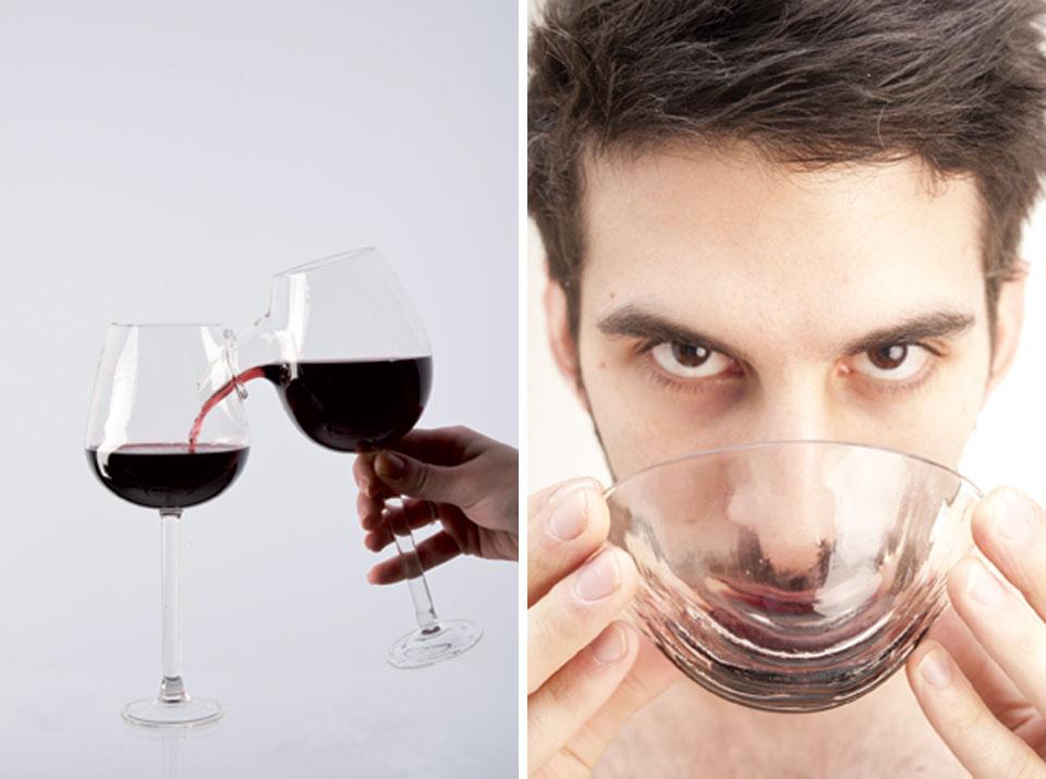 Questa coppia di bicchieri è una strizzatina d'occhio molto evidente per gustare un buon vino, ridere e scherzare e magari anche condividere momenti di intimità. Il bicchiere è qui una trasparente provocazione. Un invito curioso, una traccia possibile nell'esperienza del bere, un invito al design come tecnica dell'esperienza, come invenzione di questa.