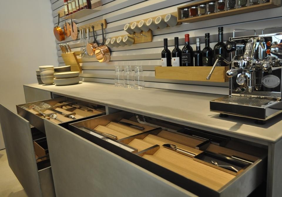 Lavoriamo a questo concetto dal 2004, ora la cucina è minimale e perfettamente funzionale. A partire dall'attrezzatura dei cassetti, che hanno divisori interni dalla forma modulare a prismi. È una cucina che lascia una grande libertà all'utilizzatore: i bisogni delle persone cambiano, man mano che cambia la loro vita, anche la cucina deve saper crescere e cambiare insieme alle persone che la usano.