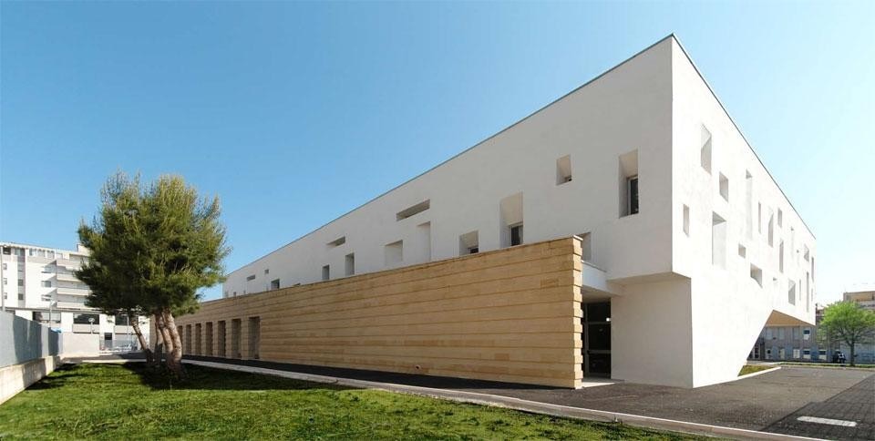 Il volume della palestra, che emerge da tali avancorpi, si distingue per i fori di varie forme e dimensioni che animano l'intonaco bianco, evocando elementi tipici dell'edilizia spontanea pugliese. L'inserimento di tale volume all'interno del complesso scolastico ha dato forma a un ampio cortile interno che assume il ruolo di 'giardino didattico'.