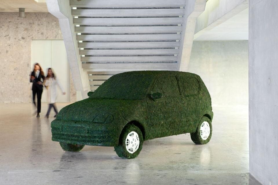 In alto: Maddalena Ambrosio, Eco-car, 2003. Polistirolo e muschio. Ettore Buganza.