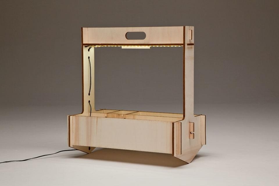 È una lampada da lavoro: oltre a illuminare la scrivania, serve a tenerla in ordine. L'accorpamento di due funzioni in un unico oggetto consente di ottimizzare lo spazio sul piano del tavolo. L'ispirazione formale di Lightbox è la tradizionale cassetta degli attrezzi, pensata qui con vani di differente ampiezza e realizzata in legno compensato spesso 8 mm, tagliato con una fresatrice. La forma a V della base di appoggio del contenitore consente di inclinarlo su entrambi i lati e di veicolare così il fascio di luce sul piano di lavoro.