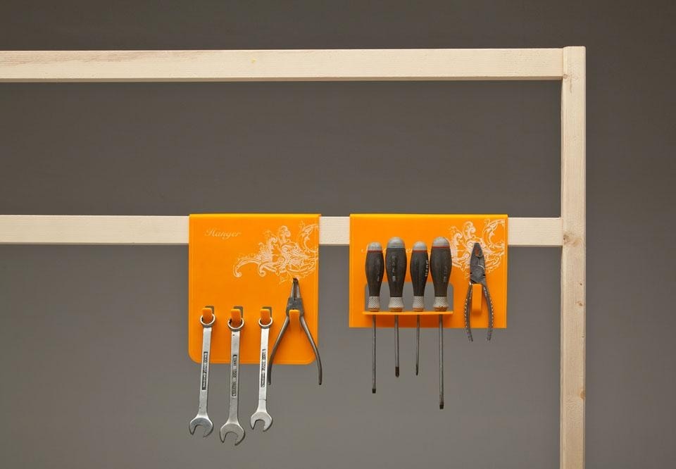 Questa struttura contenitore per laboratori e officine si ispira alle sacche in pelle dei cowboy e ai massicci cinturoni in pelle porta attrezzi. Il progetto si basa su una struttura in legno totalmente personalizzabile, in base alle esigenze individuali o a quelle imposte dallo spazio del FabLab. Si possono realizzare una rastrelliera a muro, una struttura ad angolo oppure un divisorio funzionale che è possibile utilizzare accedendo da entrambi gli ambienti che collega. A questa semplice struttura si agganciano differenti moduli funzionali adatti ad accogliere attrezzi di diverse forme e dimensioni; ogni modulo può essere tolto dalla struttura e portato nella postazione di lavoro di chi ne deve utilizzare l'attrezzatura, agganciandolo a tavoli o sedie.