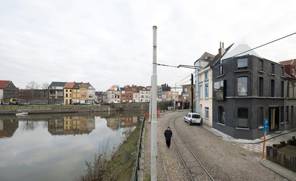 Le funzioni della residenza seguono una logica invertita rispetto alle più convenzionali case unifamiliari. Le stanze da letto si trovano infatti al piano terra, la zona soggiorno al primo piano, mentre la cucina con la sala da pranzo occupano il piano più alto e godono di viste appartate sul patio adiacente. Gli architetti hanno tentato di creare un legame simbiotico tra lo spirito del vivere contemporaneo e l'eleganza di una tipica casa d'angolo belga del XIX secolo. Tale apparente contraddizione può essere colta e sperimentata negli spazi interni della casa.