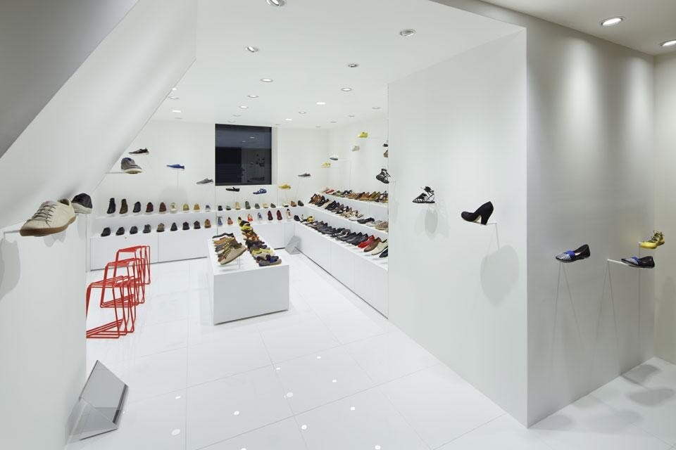 Nel nuovo showroom, infatti, le scarpe sembrano camminare da sole sospese nell'aria: sono disposte in modo da riprodurre una sorta di camminata al rallentatore. I sostegni, piccoli tubi che escono dalle pareti e dal pavimento, sono quasi invisibili e disposti in modo da creare un percorso specifico.