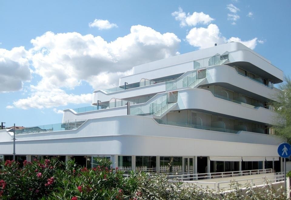 Ispirandosi alle imbarcazioni progettate proprio a Riccione, il nuovo Hotel cerca un legame con l'architettura navale della regione. Tuttavia, la trasformazione dell'edificio originario del 1960 non ha riguardato soltanto questioni estetiche, ma anche funzionali, essendo infatti necessario modernizzare i servizi dello storico hotel.