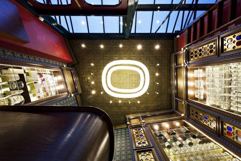 Gli interni, tutti fatti a mano, presentano scaffalature oversize in legno di noce americano retrospecchiato, con ante decorate con vetro soffiato colorato e un bancone centrale sopra il quale è sospesa una grande lampada alogena dalla forma più contemporanea. Il soffitto è rivestito con lastre di ottone decorato in bassorilievo e puntellato da faretti direzionali.