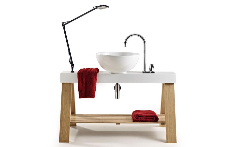 Il lavabo può essere posizionato indifferentemente al centro, a destra o sinistra con il rubinetto a canna alta o a parete. Negli estremi della trave alloggiano un piccolo ripiano di ceramica e la lampada da tavolo Kelvin Led di Flos (design Antonio Citterio con Toan Nguyen), con testa orientabile e interruttore collocato nella testa. Tra i due cavalletti un tirante d'acciaio svolge il ruolo di porta salviette.