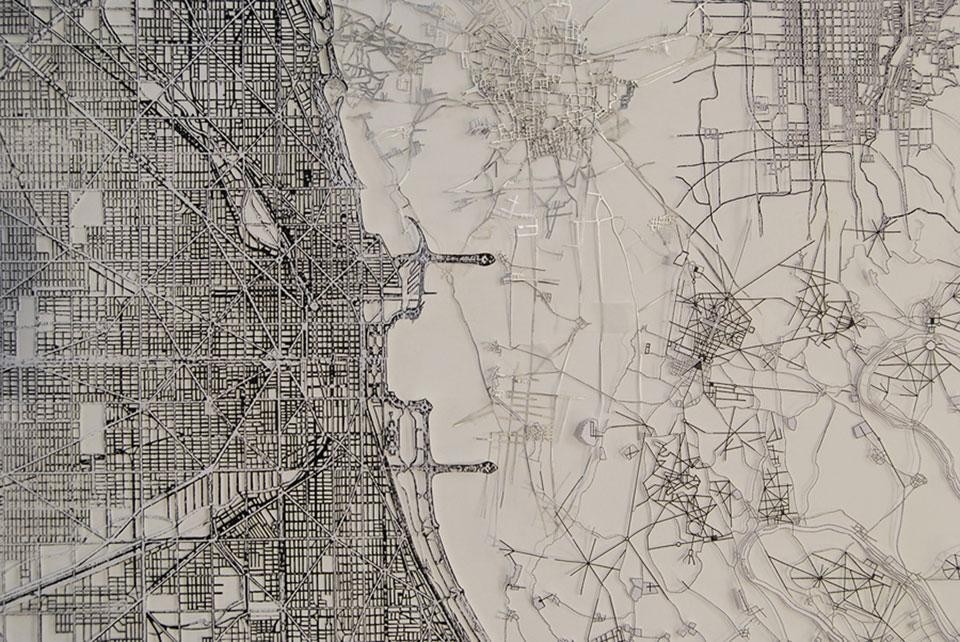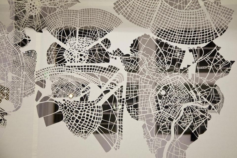 L'artista generalmente trafora con una acribia da chirurgo fogli di carta velina, foglie di vegetali piccoli o enormi, saponi e altre superfici, incluso l'intonaco. Operando con una serie di bisturi passa ore a sezionare questi materiali, ottenendo una geografia disegnata che allude a molti soggetti. Tutti pero' possono essere accomunati a un tema unitario, cioè le forme che assume la vita nel suo dilatarsi e organizzarsi. Ecco allora che troviamo, come temi e come trame sottostanti al ricamo, la maniera in cui si espandono le radici di certi vegetali, il modo in cui si sviluppano le cellule dei tessuti viventi, la maniera in cui si snodano varie tipologie di città con la loro rete di strade, circuiti che ricordano quelli elettrici e che scopriamo, invece, essere il pattern che assume il volo di una farfalla.