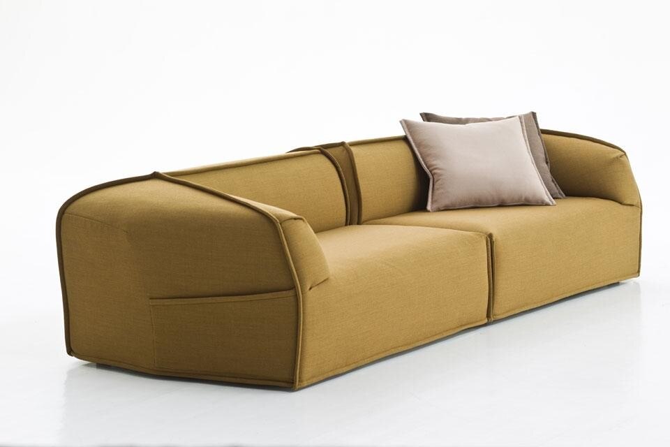 Si tratta di un sistema componibile di divano arricchito da una poltrona, una poltroncina e un tavolino. La forma si presenta compatta e rigorosa, ma tagli e linee decise disegnano il tessuto in modo asimmetrico. È caratterizzata da evidenti cuciture in rilievo, come imbastiture, che ne ripercorrono il perimetro fino a destrutturarne la linearità estetica. La struttura è in poliuretano schiumato, il rivestimento, particolarmente morbido è frutto di una combinazione accoppiata di tessuto e ovatte.