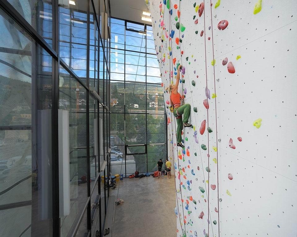 Grazie all'impiego di energia solare, e all'involucro della facciata modificabile in base alle stagioni, si è potuto evitare un sistema di raffreddamento meccanico, risparmiando costi di costruzione e di gestione. Il collegamento della palestra con la nuova piazza cittadina avviene sul lato sud, mentre in corrispondenza del parco cittadino a nord, è previsto l'accesso al nuovo garage sotterraneo. Le torri di arrampicata fisse costituiscono un tratto distintivo della palestra e offrono un punto di vista privilegiato verso la piazza e il parco, e al contempo costituiscono un osservatorio da cui tener sotto controllo tutto ciò che accade nello stesso ambiente interno. La parete da arrampicata attira sia un pubblico di arrampicatori professionisti che amatoriali, e si presta a essere impiegata per esercitazioni e concorsi.