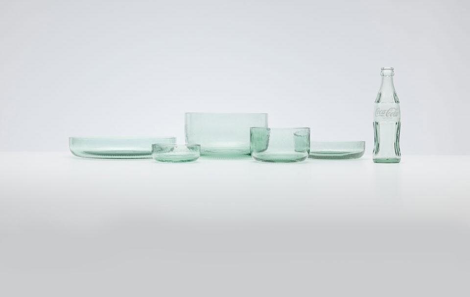 "Siamo rimasti affascinati dal particolare tono di verde, soprannominato Georgia Green, dalle bollicine di aria e dalle distorsioni, che sono il marchio distintivo del vetro riciclato; così abbiamo deciso di puntare su forme semplici che valorizzassero queste caratteristiche", spiega Oki Sato. "Ma volevamo anche permettere agli utilizzatori di ritrovare una traccia della vecchia bottiglia nei nuovi prodotti". La soluzione dello studio giapponese è stata quella di creare ciotole e piatti che mantenessero la caratteristica forma della base inferiore, mentre la parte superiore è stata tagliata via.