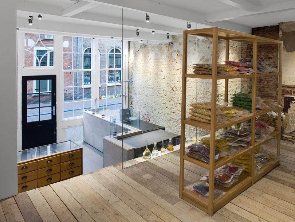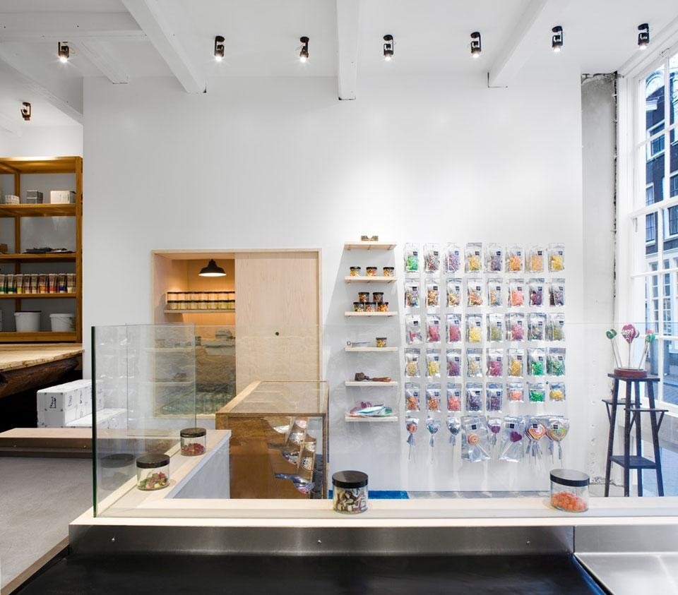 Come in tutti i negozi del brand, i visitatori possono osservare da vicino il processo di produzione delle caramelle che affascina e coinvolge bambini come adulti. Il vetro è protagonista dello spazio, e si fa interprete della vita della città mutando attraverso i diversi riflessi che riportano sulla superficie trasparente i movimenti della strada. La rifrazione sul vetro di notte è molto chiara, e lo stesso interno assume un carattere neutro e riflettente.