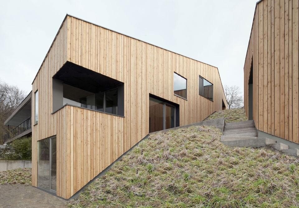 Mentre il perimetro esterno della casa risulta essere perfettamente allineato al confine della proprietà, all'interno gli architetti si concedono delle variazioni più dinamiche. I tetti emergono gradualmente dal lato dell'ingresso, raggiungendo il loro picco di pendenza nel punto in cui i due edifici sono più vicini. In questo modo è favorita la creazione di ambienti con che arrivano fino a 5 metri di altezza.