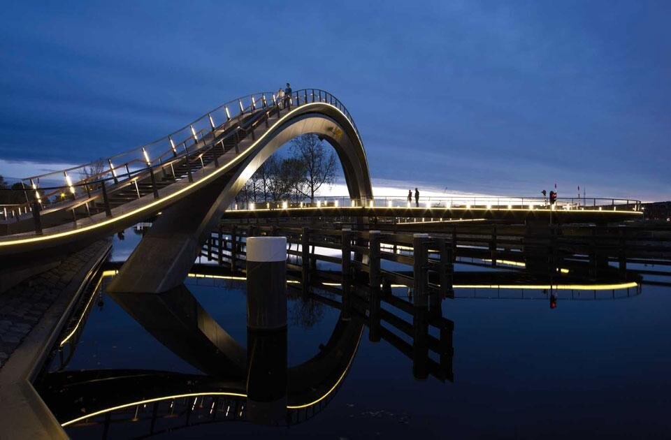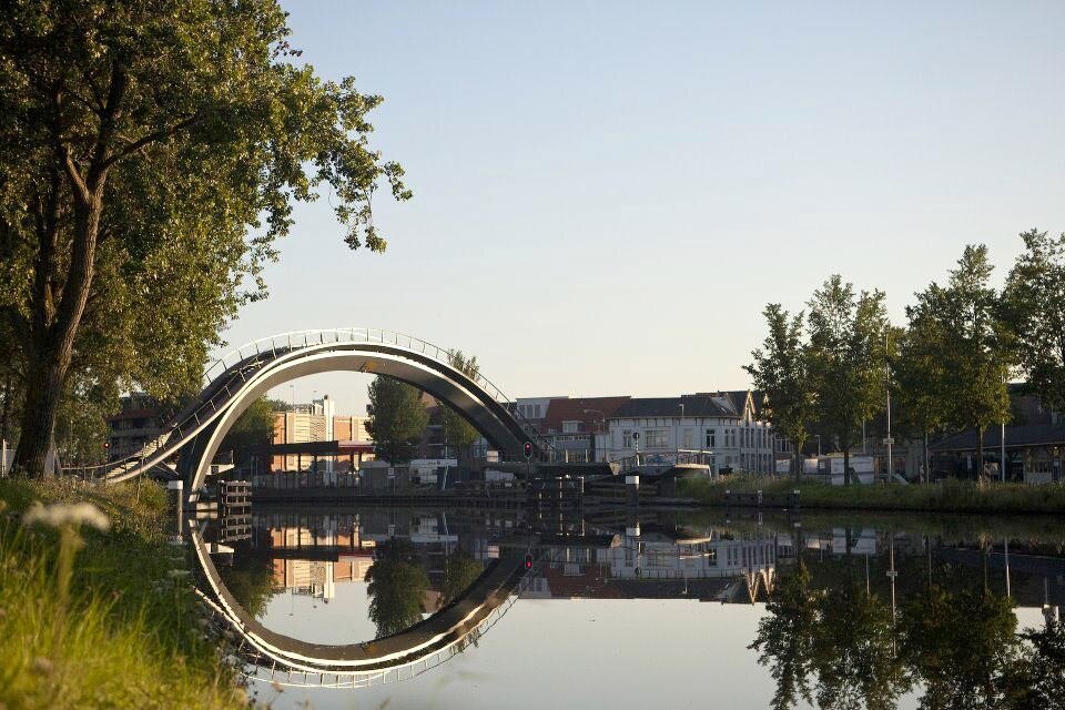 Un ponte scultoreo, definito da una ripida arcata pedonale e da un percorso sottostante destinato anche a mezzi su ruote, è il nuovo collegamento tra il centro storico e la nuova area di sviluppo della cittadina olandese.