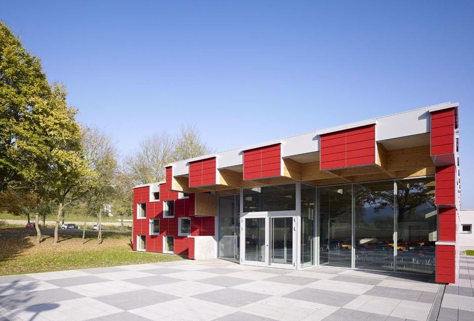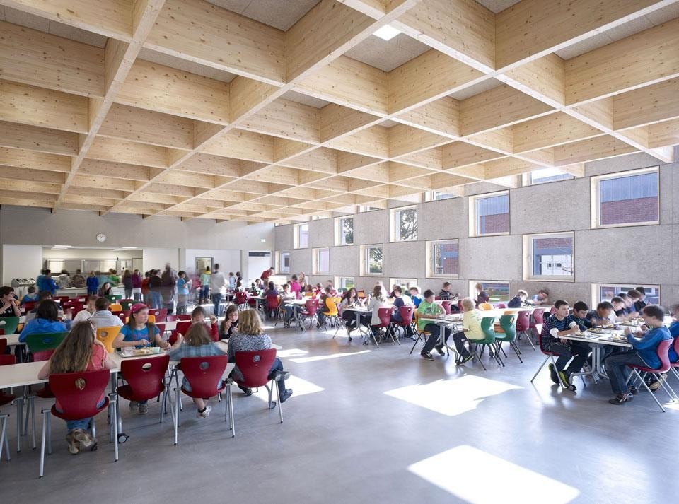L'ampia vetrata che distingue l'ingresso principale proietta la mensa verso l'esterno, mentre la copertura a sbalzo crea una zona di transizione tra l'interno e il parco giochi dove il motivo a scacchiera si ritrova in due "aule esterne" costituite da cubi di cemento sfalsati, che consentono agli studenti di sedersi, correre, saltare e a "far sprigionare tutta l'energia in eccesso che si accumula in aula". Per lasciare visibile anche sul soffitto la griglia, tutte le condotte di ventilazione e di illuminazione sono incassate nel soffitto. L'illuminazione integrata riproduce così dei quadrati di legno incandescenti che trasformano le capriate strutturali in un elemento di design. Le componenti basilari dell'edificio sono il cemento, il legno e la ceramica.