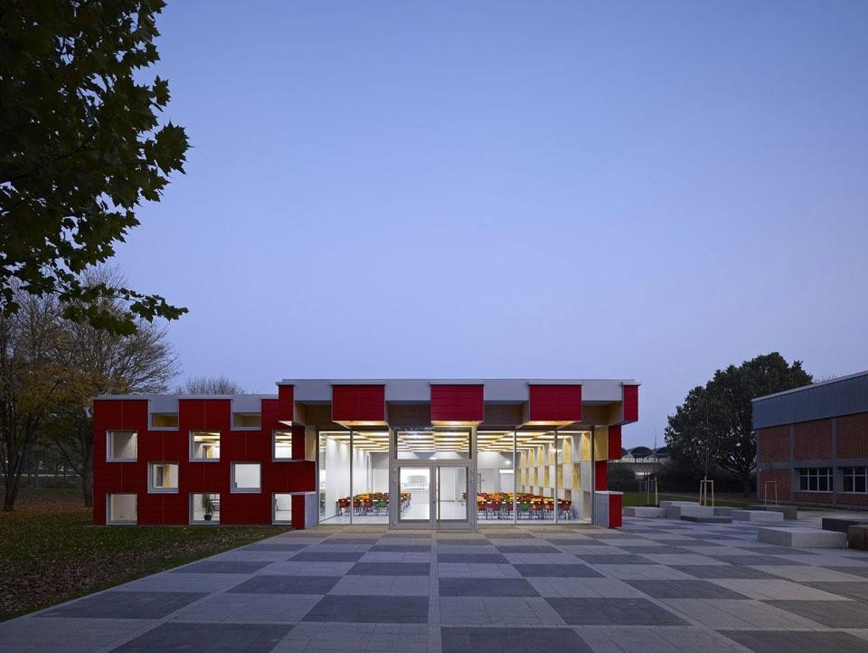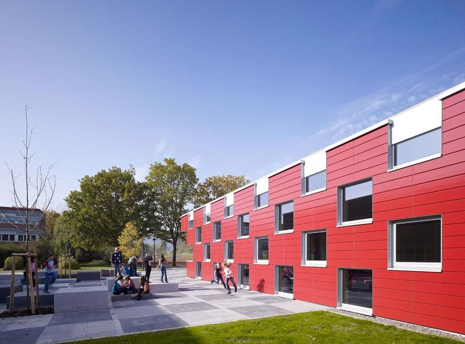 "Le finestre quadrate e la facciata di colore rosso sono state ispirate dall'idea di creare un edificio ludico e interattivo, ma efficiente", affermano gli architetti. "Il punto di partenza è stata la pianta quadrata, e l'idea di una griglia con due direzioni". Questa griglia è stata poi trasferita sulla stessa facciata dell'edificio, generando con le numerose finestre un motivo vivace, che richiama la facciata originale del 1970 diffondendo un'enorme quantità di luce all'interno dell'edificio. Secondo gli architetti, in questo modo si è potuto creare uno spazio "a misura d'uomo, con differenti prospettive e interessanti scorci".
