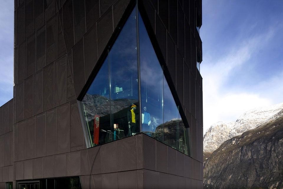 L'intervento di trasformazione evidenzia e valorizza il ruolo di landmark che la struttura detiene, ponendosi come elemento simbolico che segna l'ingresso alla città, esaltando il carattere commerciale dell'area. "Il progetto", spiegano gli architetti, "si ispira alle montagne e agli elementi naturali circostanti a cui è legata la stessa attività commerciale che si concentra prevalentemente su articoli sportivi".