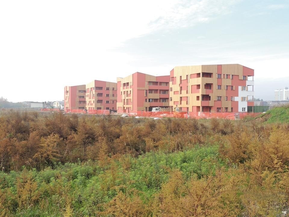 L'intonaco delle facciate color vinaccia, sfumatura della terra, viene accostato ad elementi in legno che compongono un gioco di movimenti volto alla creazione di un disegno su tutti i lati degli edifici, proiettando un chiaroscuro sugli edifici che altrimenti risulterebbero dei volumi piatti.