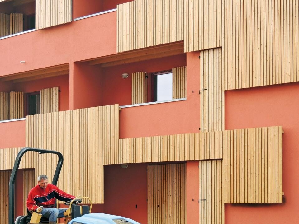 Il rivestimento in legno, fornito da Rubner Objektbau, è stato impiegato come dispositivo energetico e di confort, e al contempo risulta funzionale per caratterizzare e distinguere ogni appartamento. I quattro edifici si caratterizzano in maniera sempre differente eliminando così l'indifferenza della ripetitività. Ogni abitante si identifica con il suo appartamento, con il suo nuovo luogo d'abitare.